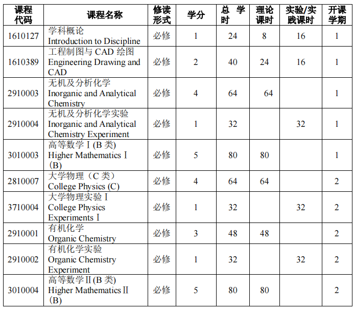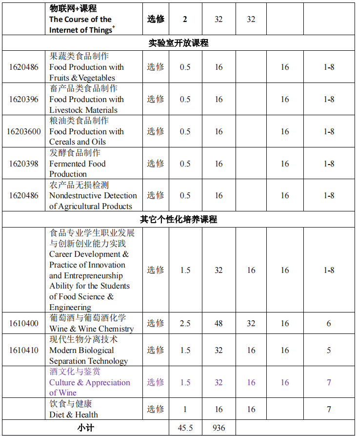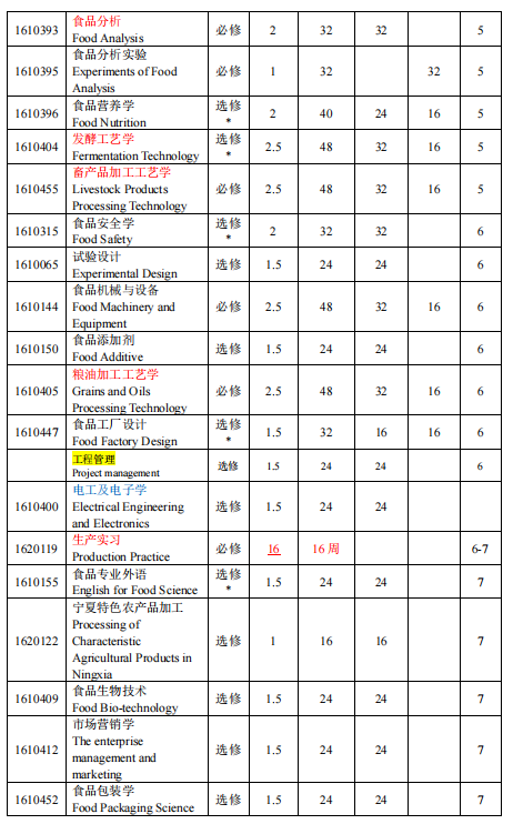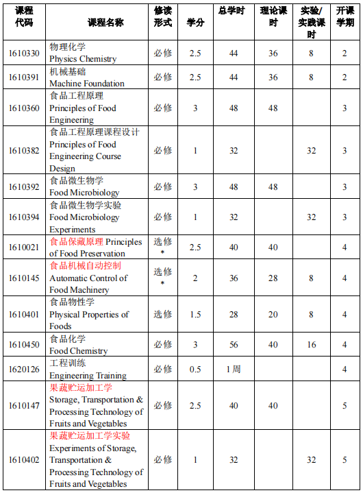 马克思主义基本原理、大学英语、高等数学、食品微生物学、食品工程原理、生物化学、食品化学、食品分析、食品技术原理、食品机械与设备、毕业生产实习、毕业设计(论文)。