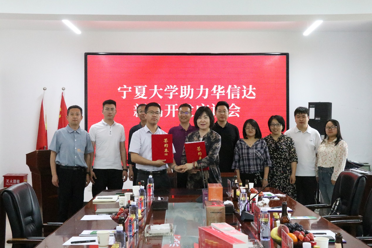 在宁夏华信达生物科技有限公司,公司副总经理兼技术总监、学院校友张智峰主持座谈会,并介绍了公司有关情况;灵武市科技局副局长陈建军、市委组织部人才室主任杨宁分别就灵武市食品企业需求与人才政策进行了详细介绍,并希望学院与灵武市深入合作,共同促进灵武市食品企业的科技创新与快速发展;宁夏华信达生物科技有限公司总经理武康宁针对公司新产品开发市场需求等进行交流探讨,并提出在今后的科技储备、新产品开发、人才培养等方面与学院深度合作;李文华结合学院发展历程、人才培养、科研创新、社会服务和毕业生就业等方面,就院企政深度合作谈了自己的建议;张惠玲教授结合企业产品研发与技术创新情况谈了自己的看法,她指出,随着信息技术的快速发展,企业必须紧跟时代步伐,加大研发投入,推动技术创新和产业升级。座谈会结束,张惠玲教授与夏华信达生物科技有限公司武康宁总经理签署了合作协议。