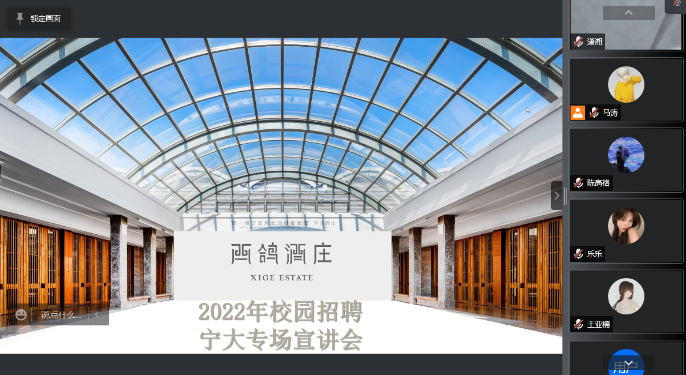 为了更好的拓宽毕业生就业渠道,2022年4月1日下午14:00,西鸽酒庄举办了线上招聘会议。通过PPT展示讲解的方式,HR向同学们介绍了公司的午夜av、现有产业结构、组织构架、福利待遇。西鸽酒庄成立于2017年,酒庄总建筑面积约2.5万平米,包含葡萄酒酿造区、橡木桶酒窖、灌装区、瓶装陈酿酒窖、专业品鉴区、游客接待中心、庄园酒店和有机特色餐厅,年设计产能1000万瓶,是宁夏综合设施相对完整、建筑标准超卓的酒庄。作为酒庄长期发展规划的一部分,西鸽种植团队仍在不断挑选优异条件的地块,预计22年将新开超过1万亩新地。此外,西鸽也持续投入品种及技术创新,不断挖掘宁夏风土的潜力与未来。此外我们也与法国波尔多学院,国内业内顶尖高校携手教研实践项目,为创新技术时间及人才培养提供平台。