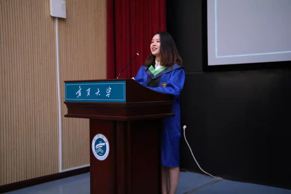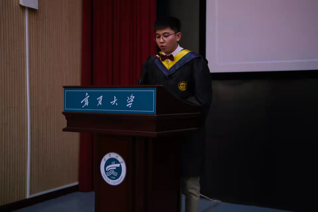 在温馨的音乐下,毕业典礼拉开序幕。本科毕业生代表牛玉平、硕士毕业生代表周婷依次发言。春萌青草,夏沐芳华,秋染落叶,冬凝雪花,他们回忆了求学中的点点滴滴,懵懂的少年在时光的磨炼、师长的指导、同窗的陪伴与鼓励成长为可以为祖国建设的优秀青年。感恩宁大、感恩食葡、感恩恩师、感恩同窗,他们表示会在今后道路上铭记“尚德、勤学、求实、创新”的校训、传承发扬“沙枣树精神”、牢记学院的嘱托、带着大家的祝福以青春之我,创理想未来。再见时,愿君明媚如初、灿烂如初。