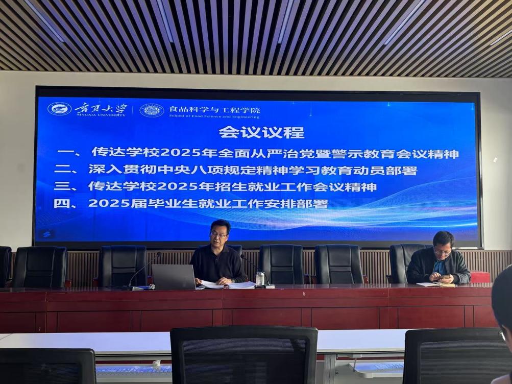 会议开始,李文华副书记传达了学校2025年全面从严治党暨警示教育会议精神,对学院深入贯彻中央八项规定精神学习教育进行动员部署,并结合学校通报的典型案例进行了警示教育。他指出,全院教职工要牢固树立纪律意识和底线思维,筑牢思想防线,进一步严肃工作作风。李书记还传达了学校2025年招生就业工作会议精神,并就学院2025届毕业生就业工作进行了安排部署,强调要压实责任、主动作为,切实做好2025届毕业生的就业指导与服务,全力推进毕业生高质量充分就业。