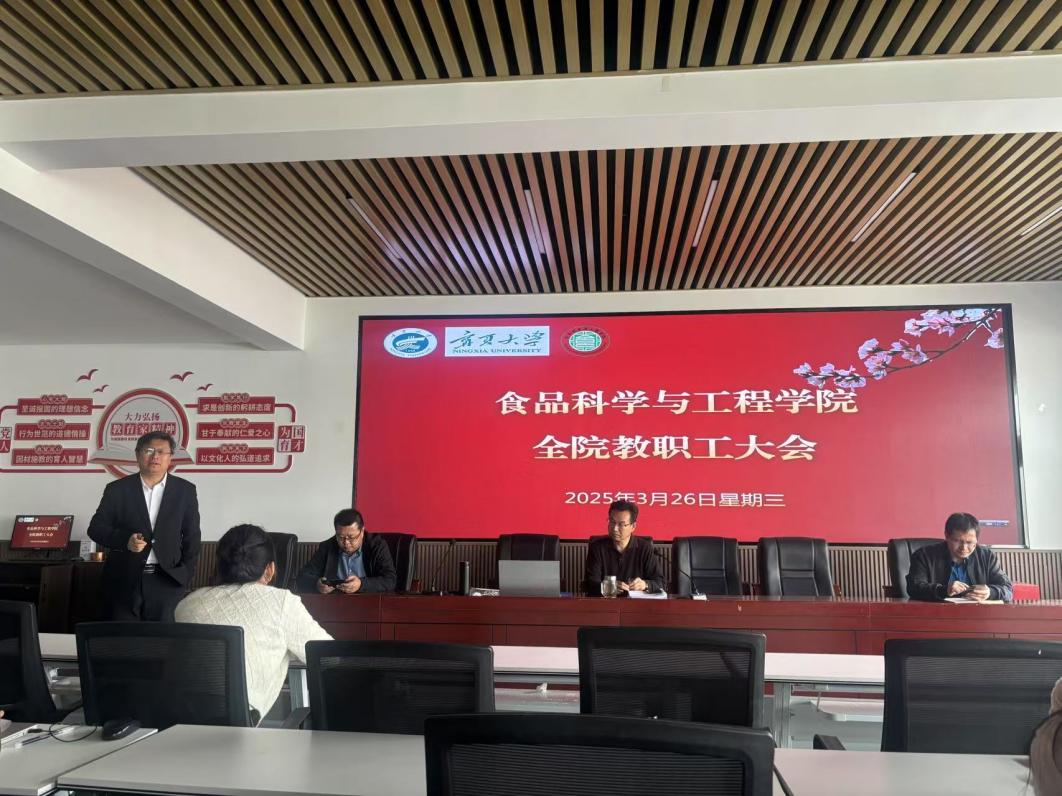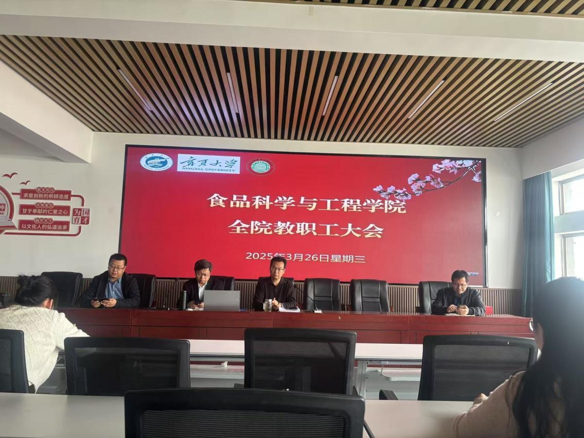 在明远楼512会议室召开2025年春季学期第二次全院大会,全面传达学校相关工作会议精神,并部署学院近期重点工作。会议由李文华副书记主持,学院领导班子及全体教职工参加。