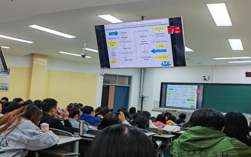 课程上,吕少英博士报告内容为《Production of Corn Starch and Sugar》,围绕发酵前处理的玉米淀粉和淀粉糖的制备及产业化为同学们进行了讲解,同学们听后深受启发。
