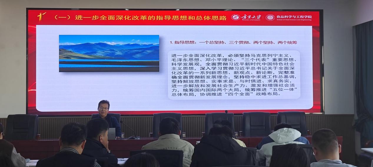 随后,李文华聚焦于进一步全面深化改革的总体思路与系统部署,条分缕析地讲解了全会所规划的改革蓝图架构,以及各领域改革的相互关系、推进节奏与协同策略等,使教职工们对国家全面深化改革的顶层设计有了清晰的认知与理解,为在各自工作岗位上积极对接与践行改革举措奠定了理论基础。