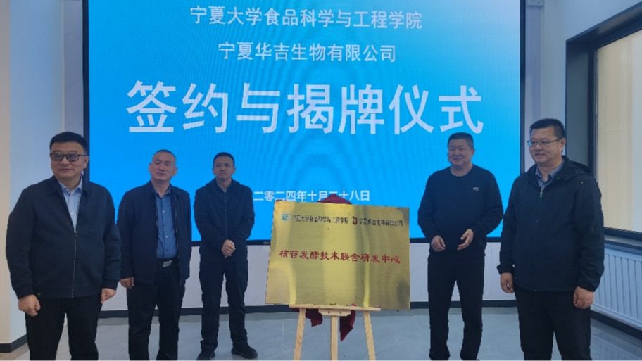 2024年10月28日,午夜av 健康食品生物制造团队与宁夏华吉生物有限公司合作签约暨“核苷发酵技术联合研发中心”揭牌仪式在华吉生物公司技术中心隆重举行。