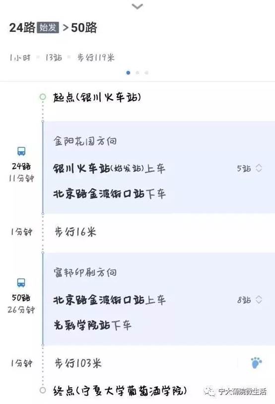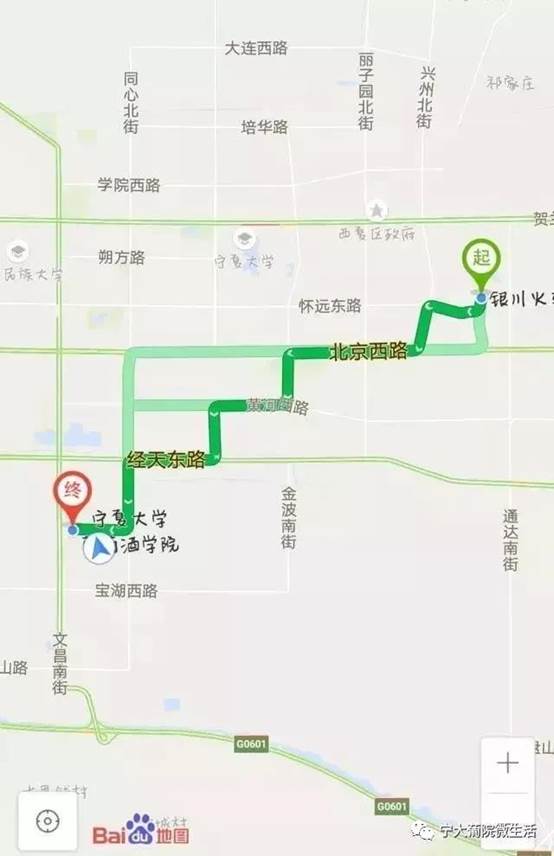 学院门口有36路、50路公交站,终点站为银川火车站。