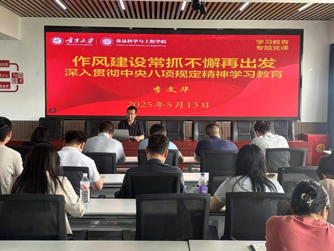 在讲授中央八项规定精神的主要内容时,他围绕“坚持求真务实、改进调查研究”“精简会议活动、反对形式主义”“倡导文风简朴、厉行节约反对浪费”等方面,分析了当前存在的问题和具体表现,强调要警惕形式主义会议、照本宣科调研、过度包装宣传等偏离中央八项规定精神本质的问题行为,提醒广大党员时刻自警自省,不踩红线、不越底线。结合高校教师职责,李书记提出,高校党员教师要以身作则,在教学、科研、管理等方面切实践行中央八项规定精神,营造风清气正的教书育人环境。