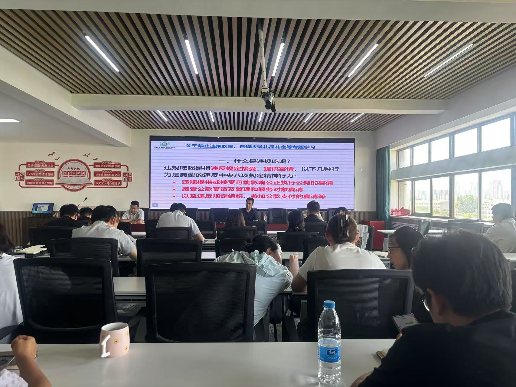 会议最后,李文华书记结合深入贯彻中央八项规定精神学习教育,为大家开展了“禁止违规吃喝、违规收送礼品礼金等”专题学习讲座。他从什么是违规吃喝、认定违规吃喝的关键、什么是违规收送礼品礼金、哪些礼品礼金不能收送,以及《中国共产党纪律处分条例》《中华人民共和国公职人员政务处分法》《党政机关厉行节约反对浪费条例》等党纪法规中,对违规吃喝、违规收送礼品礼金行为的处理等,并结合近年来发生的典型案例进行了详细的讲解。他强调,我们一定要深刻领悟习近平总书记关于禁止违规吃喝、违规收送礼品礼金,以及深入贯彻中央八项规定精神学习教育的重要讲话和重要指示批示精神,切实认识到违规吃喝、违规收送礼品礼金等行为的恶劣本质;要坚决明确违规吃喝、违规收送礼品礼金等行为绝非简单的人情往来,其背后隐藏着利益勾兑的暗流,潜藏着破坏政治生态、损害党和人民事业的巨大风险;要深入贯彻习近平总书记的指示,坚决杜绝违规吃喝、违规收送礼品礼金等问题,讲规矩、守底线,以实际行动维护好风清气正的政治环境。