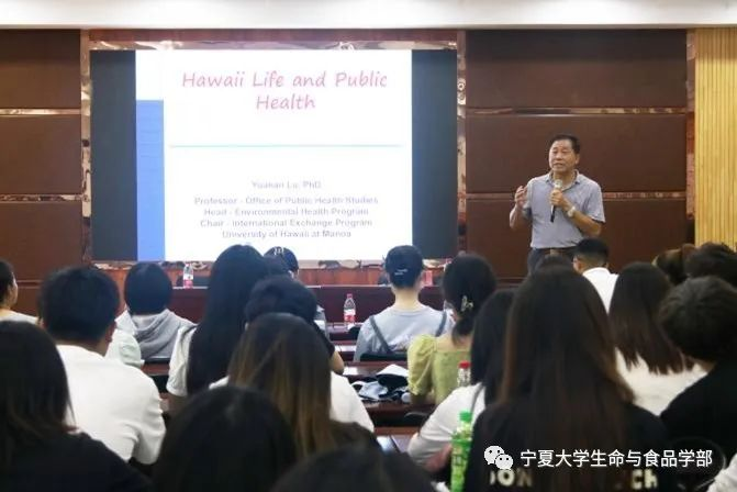 为庆祝宁夏大学建校65周年,6月16日,食品科学与工程学院特别邀请了美国夏威夷大学公共卫生学院公共卫生学院终身教授、病毒学专家鲁元安到生命与食品学部、食品科学与工程学院进行学术交流,并为教师和研究生作了题为“Hawaii Life and Public Health”和“SCI论文写作要点和要求”的两场精彩学术报告。报告由食品科学与工程学院副院长方海田教授主持。200余名师生聆听了报告。