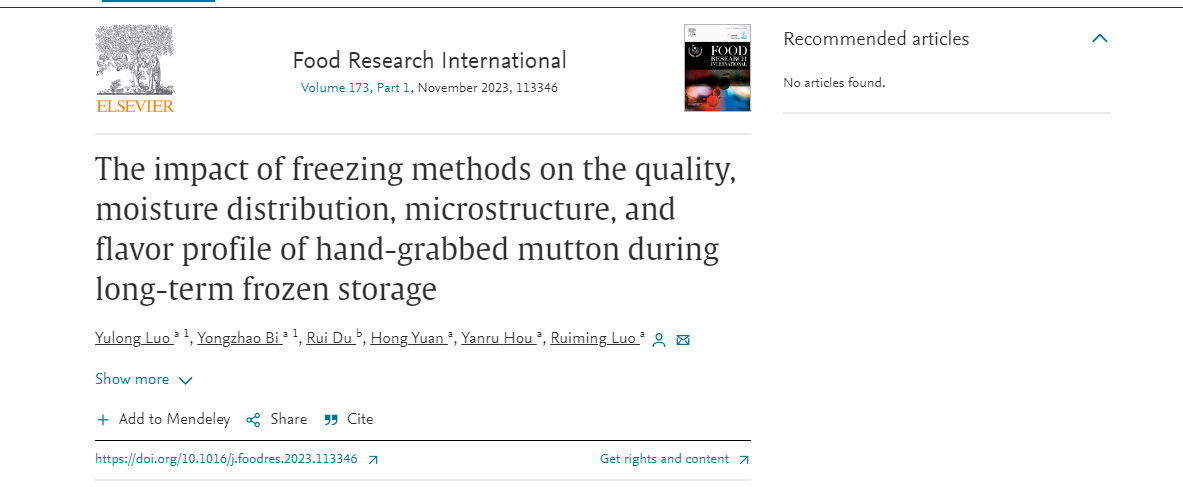 2023年8月6日,宁夏大学食品科学与工程学院罗瑞明教授团队在国际食品Top期刊《Food Research International》(Q1,IF: 8.1)发表题为“The impact of freezing methods on the quality, moisture distribution, microstructure, and flavor profile of hand-grabbed mutton during long-term frozen storage”的研究性论文。